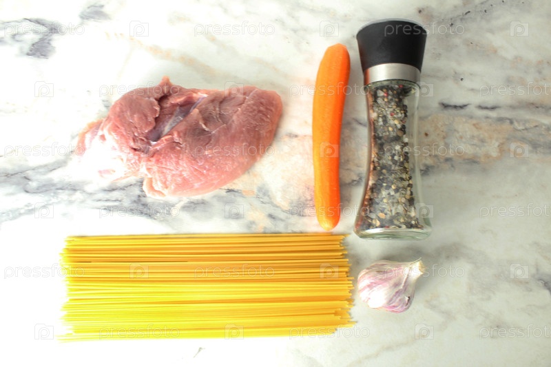 Мясо, фарш, спагетти, морковь, чеснок, специи, перец, вид сверху