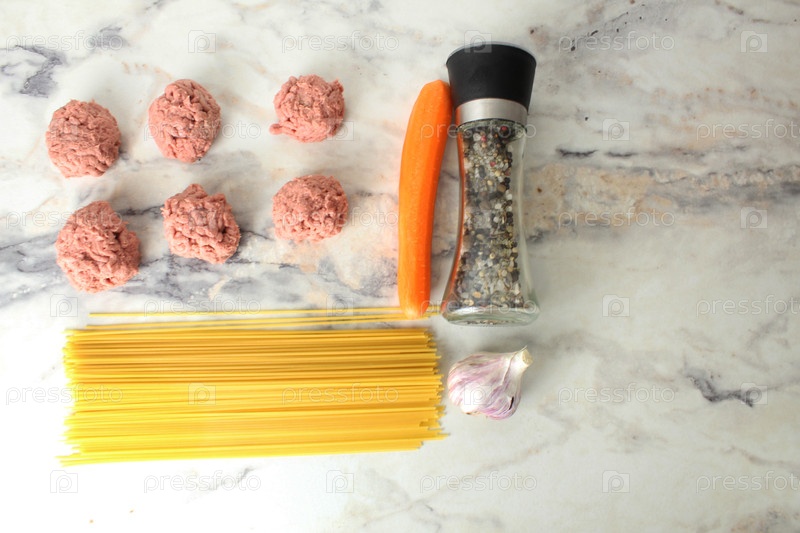 Ингредиенты макаронного спагетти с мясными шариками Катлетами Top View