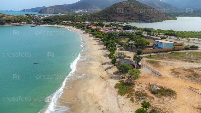 Вид с воздуха на прибрежную деревню и песчаный пляж