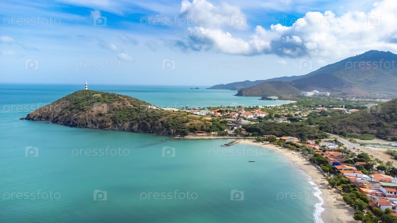 Вид с воздуха на прибрежную деревню и песчаный пляж
