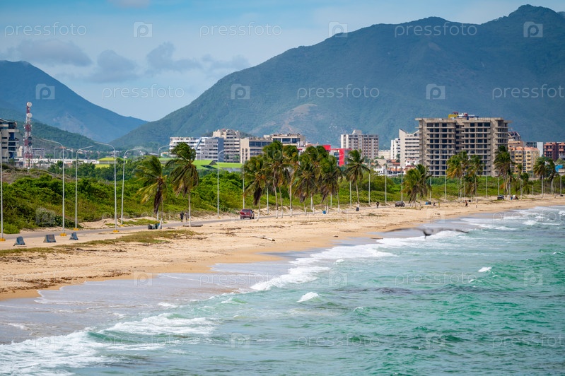 Вид с воздуха на прибрежную деревню и песчаный пляж