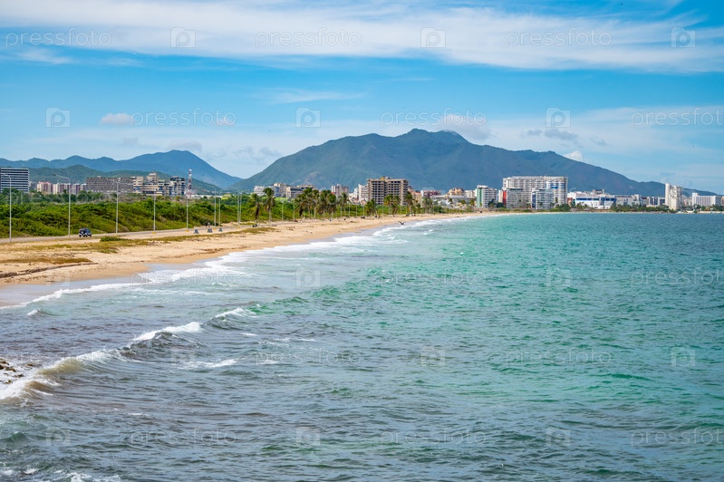 Вид с воздуха на прибрежную деревню и песчаный пляж