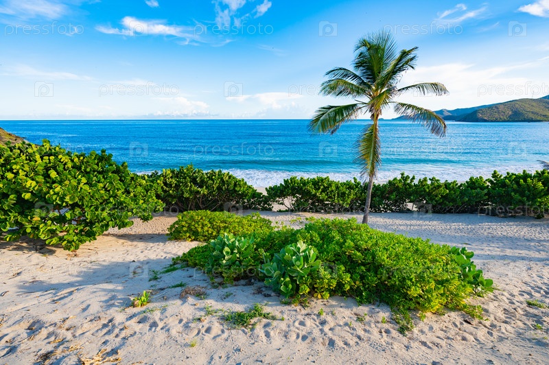 Вид на живописный пляж с пальмами и маяком