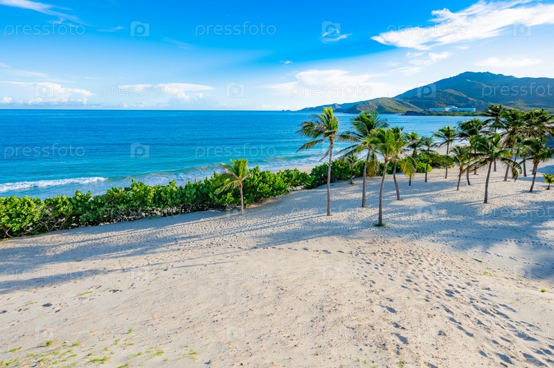 Вид на живописный пляж с пальмами и маяком