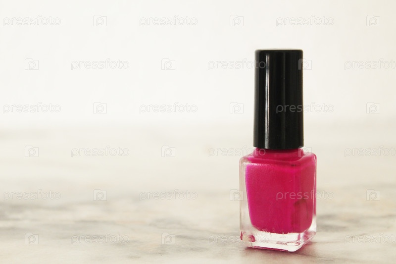 Розовая банка с лаком для ногтей с черной крышкой на белом фоне