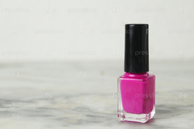 Розовая бутылка лака для ногтей с черной крышкой на белом фоне