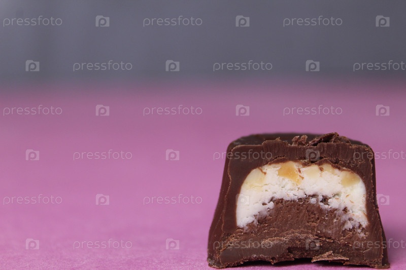 Шоколадные конфеты с пралине и кусочками грецкого ореха на розовом фоне крупный план со свободным пространством для копирования текста