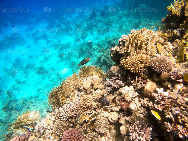 Тропические рыбы плавают возле кораллового рифа в Красном море, Египет