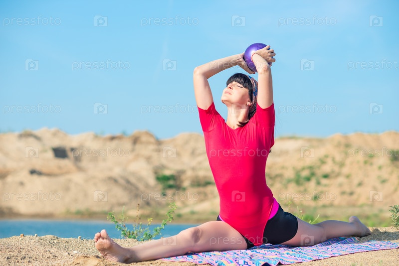 Тонкая атлетичная девушка выполняет гимнастические упражнения с мячом, сидящим в расщелинах на пляжном песке возле воды