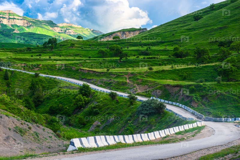 Красивый горный пейзаж с поворотом в дороге на зеленом склоне. Северный Кавказ
