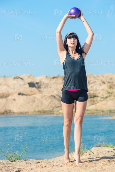 Тонкая спортсменка делает гимнастические упражнения с мячом на песчаном пляже возле воды