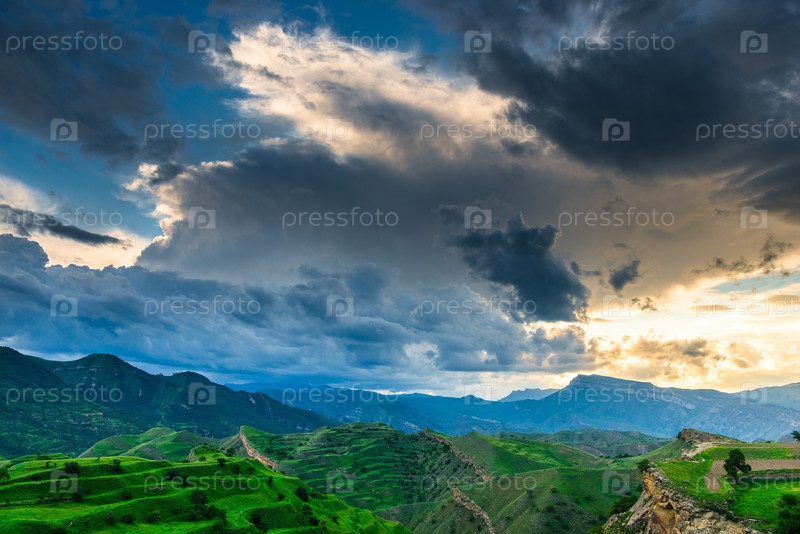 Невероятно красивый пейзаж с облаками и зелеными террасовыми горами