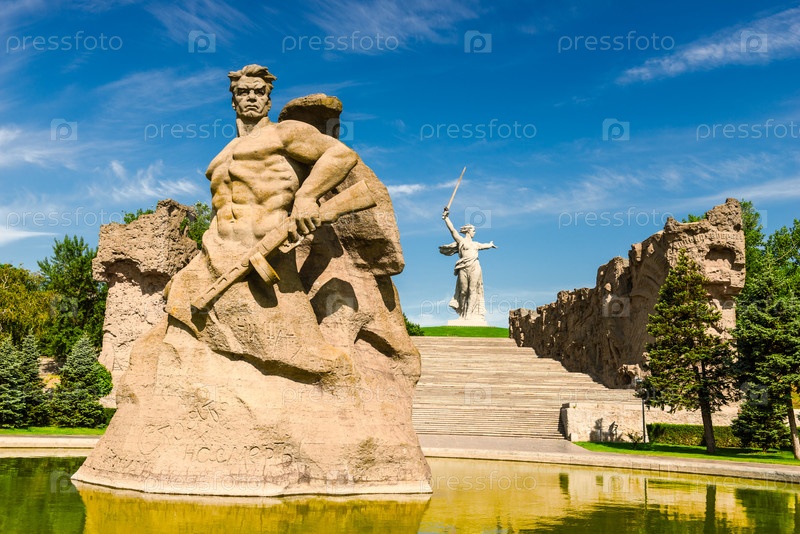 Мемориальный памятник 'Стой на смерти' на фоне скульптуры 'Родина зовет!' на Мамаевском кургане и фонтана на площади Героев в Волгограде