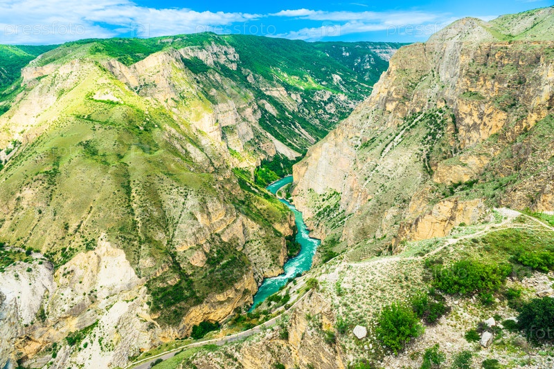 Панорамный пейзаж глубокого живописного каньона Кавказских гор Дагестана и лазурной горы реки Сулак