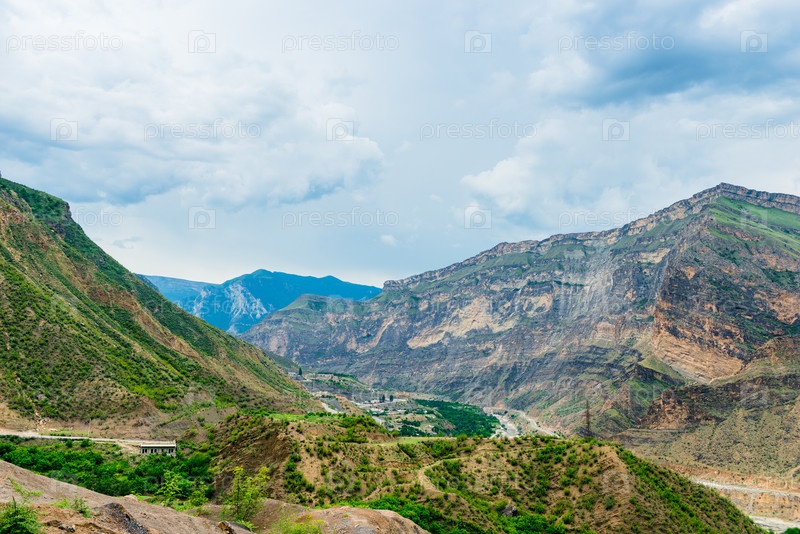 Драматический пейзаж долины горной реки среди красивых скалистых гор Северного Кавказа Дагестана