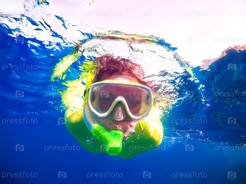 Портрет маскированной женщины со шноркелем, плавающей под водой в море