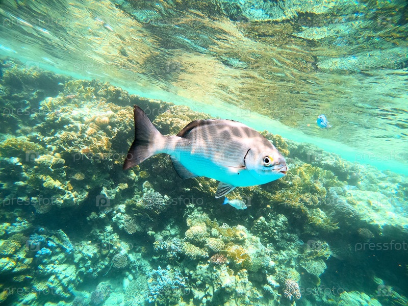 Тропические рыбы плавают возле кораллового рифа в Красном море