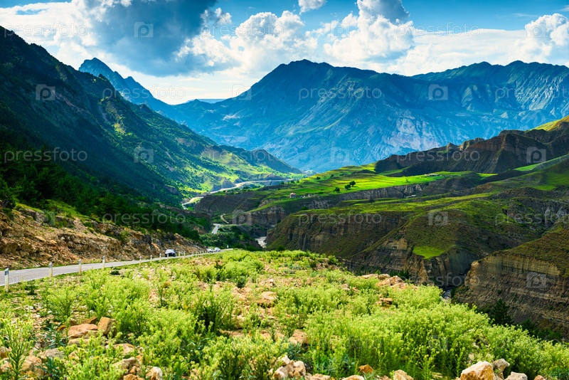 Красивый горный пейзаж с дорогой среди зеленых гор в Дагестане. Кавказ