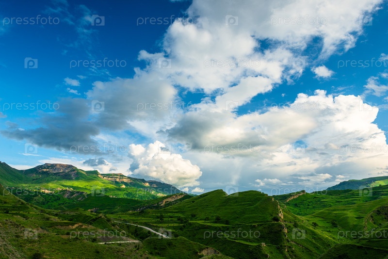 Живописный горный пейзаж с зелеными склонами и дорогой