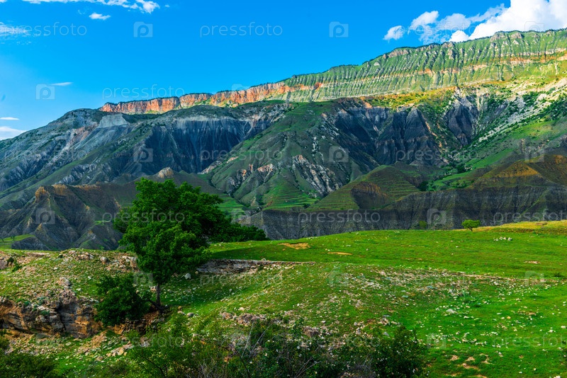 Живописный горный пейзаж с горными пастбищами на фоне красивых гор.Дагестан, Кавказ