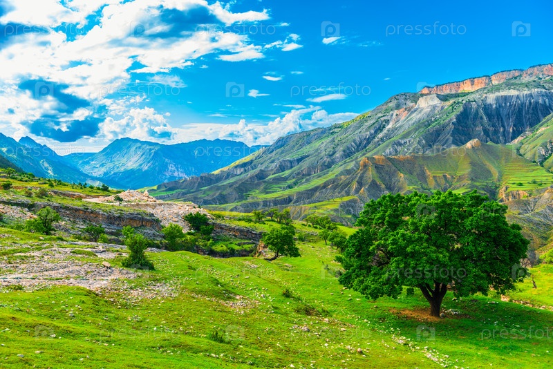 Живописный горный пейзаж с одиноким деревом на фоне красивых гор.Дагестан, Кавказ
