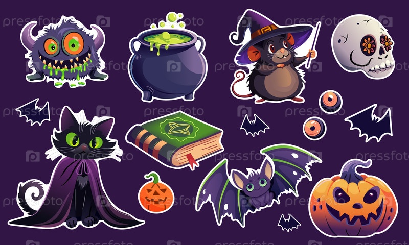 Забавные и жуткие наклейки в стиле мультфильмов для Хэллоуина. включает призраков, летучих мышей, тыкву и многое другое в игривом стиле иллюстрации