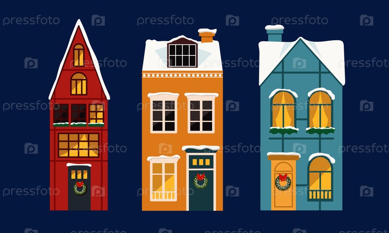Уютная коллекция зимних домов со снежными крышами отлично подходит для карты праздников, сезонного декора и проектов зимней тематики