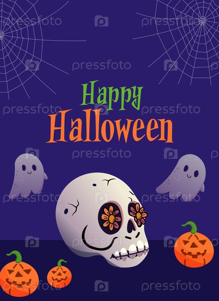 Призрачный афиша Хэллоуина с шлюхой, тыквой и привидением