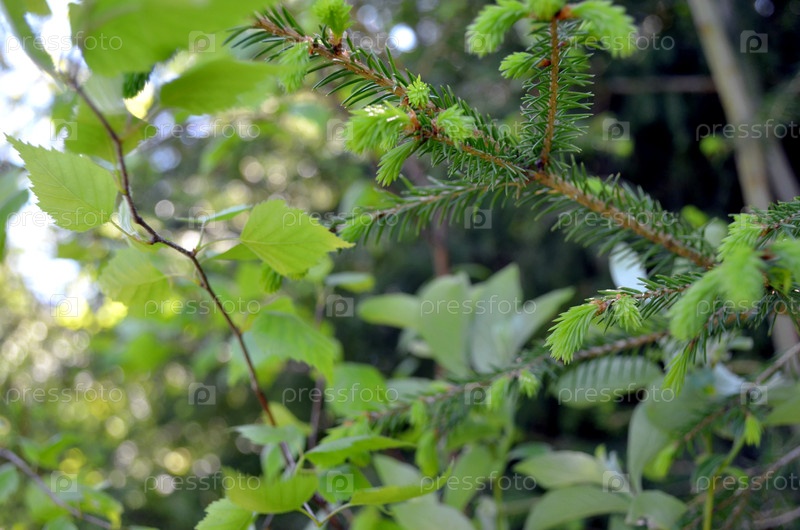 Молодые стволы березы и ели в лесу