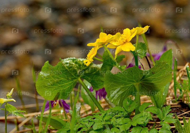 Цветение болота Калужницы на берегах водно-болотных угодий реки Том