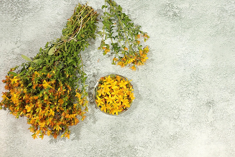 Букет сухофруктов на бетонном столе для сбора полезных трав и лечения по народным рецептам, Лечебный травяной чай, концепция альтернативной традиционной медицины, реклама зеленой аптеки