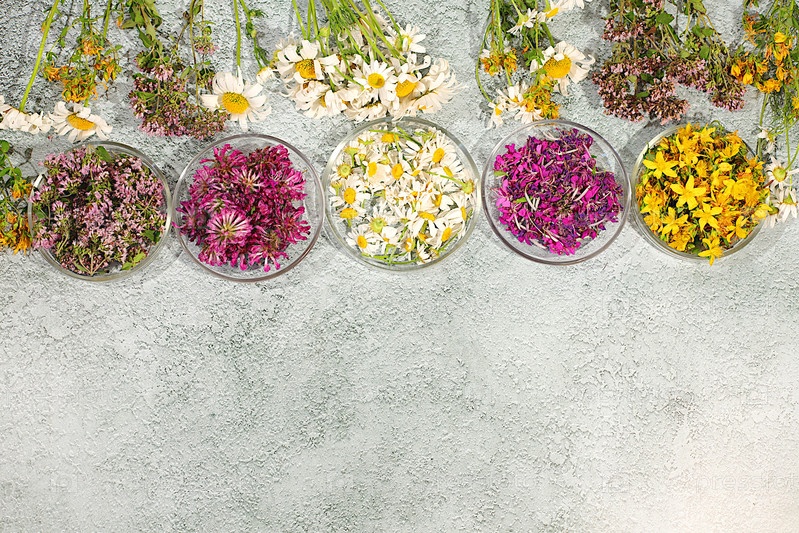 Лечебные травы и их цветочные лепестки в стеклянных чашках для инфузий или чая, концепция альтернативной традиционной медицины, реклама зеленой аптеки, сбор полезных трав для лечения
