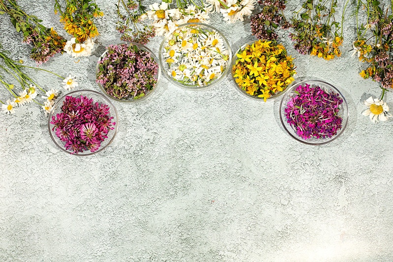 Лечебные травы и их цветочные лепестки в стеклянных чашках для инфузий или чая, концепция альтернативной традиционной медицины, реклама зеленой аптеки, сбор полезных трав для лечения