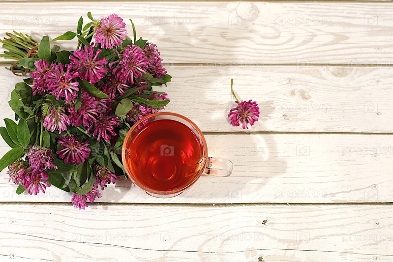 Инфузия клевера в стакане с букетом цветов, лекарственный травяной чай, концепция альтернативной традиционной медицины, реклама зеленой аптеки, коллекция полезных трав для лечения по народным рецептам