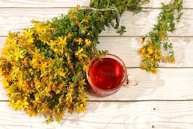Лечебный травяной чай или инфузия стервятника в стакане с цветами, концепция альтернативной традиционной медицины, реклама зеленой аптеки, сбор полезных трав для лечения по народным рецептам,