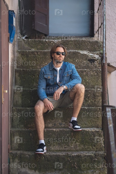 Молодой человек в джинсовом куртке и белом футболке сидит на открытой лестнице, улыбаясь. Неформальный летний стиль с солнцезащитными очками, шортами и кроссовками. Счастливая, расслабленная атмосфера