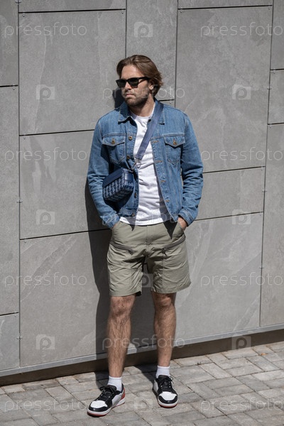 Стильный молодой человек в джинсовой куртке, белой футболке и шортах уверенно позирует на серой стене