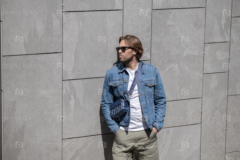 Стильный молодой человек в джинсовой куртке, белой футболке и шортах уверенно позирует на серой стене
