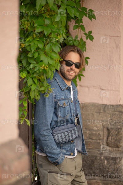 Стильный молодой человек в джинсовом куртке и солнцезащитных очках уверенно позирует на фоне деревенской стены, покрытой дикими виноградами, излучающими прохладные городские вибрации