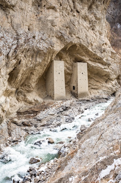 Древние сторожевые башни в ущелье Аргун с живописной рекой