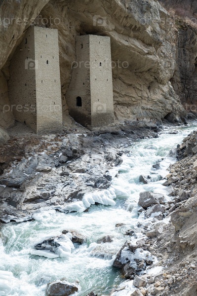 Древние сторожевые башни в ущелье Аргун с живописной рекой