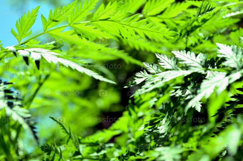 Лесное купание. зеленые, резные листья на фоне голубого неба