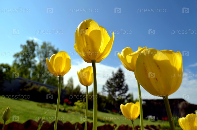 Желтые тюльпаны на фоне синего неба