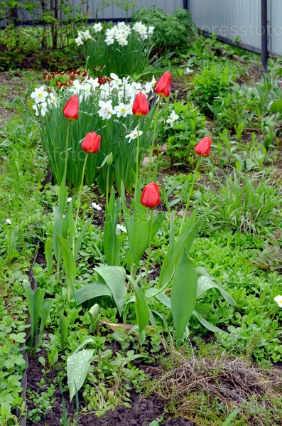 Цветут тюльпаны, нарциссы, примарозы в цветочном саду