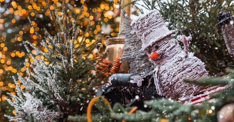 Новогодняя открытка 2026. Рождественский фон со снежным человеком. Концепция подготовки и украшения к Новому году. Игрушки для отдыха и снежников на улицах Москвы