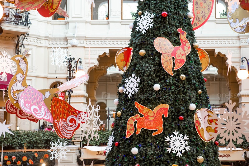 Москва, Россия, 9 января 2025 г. Центральный магазин GUM на Красной площади. Декорация в стиле хохломы. Рождественские украшения в городе. Праздничные пейзажи