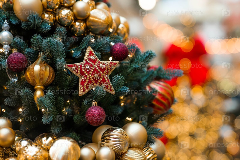 Праздник игрушек в красно-золотых цветах на рождественской елке. Новогодняя открытка 2026. Атмосферный Рождественский фон. Концепция подготовки к Новому году