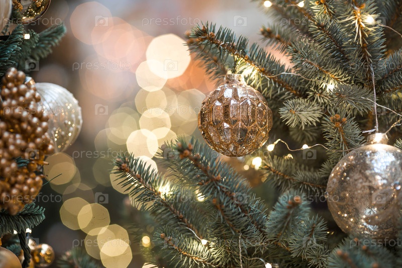 Новогодняя открытка 2026. Рождественский фон. Празднование золотых игрушек на новогодней елке. Концепция подготовки декора и украшений к новому году. Новый год 2026