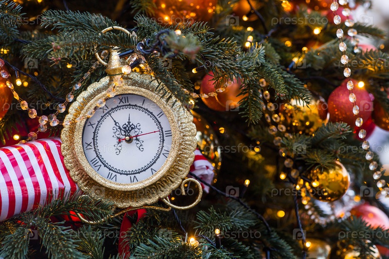 Часы на циферблатах показывают 12 часов. Золотые ретро-часы на рождественской елке. Красивый фон в канун Нового года или Рождества 2026
