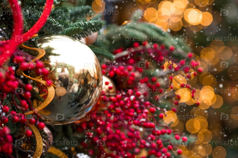 Красные, праздничные игрушки на рождественской елке в Москве. Волшебный Рождественский фон. Концепция подготовки и украшения к Новому году. Новогодняя открытка 2026